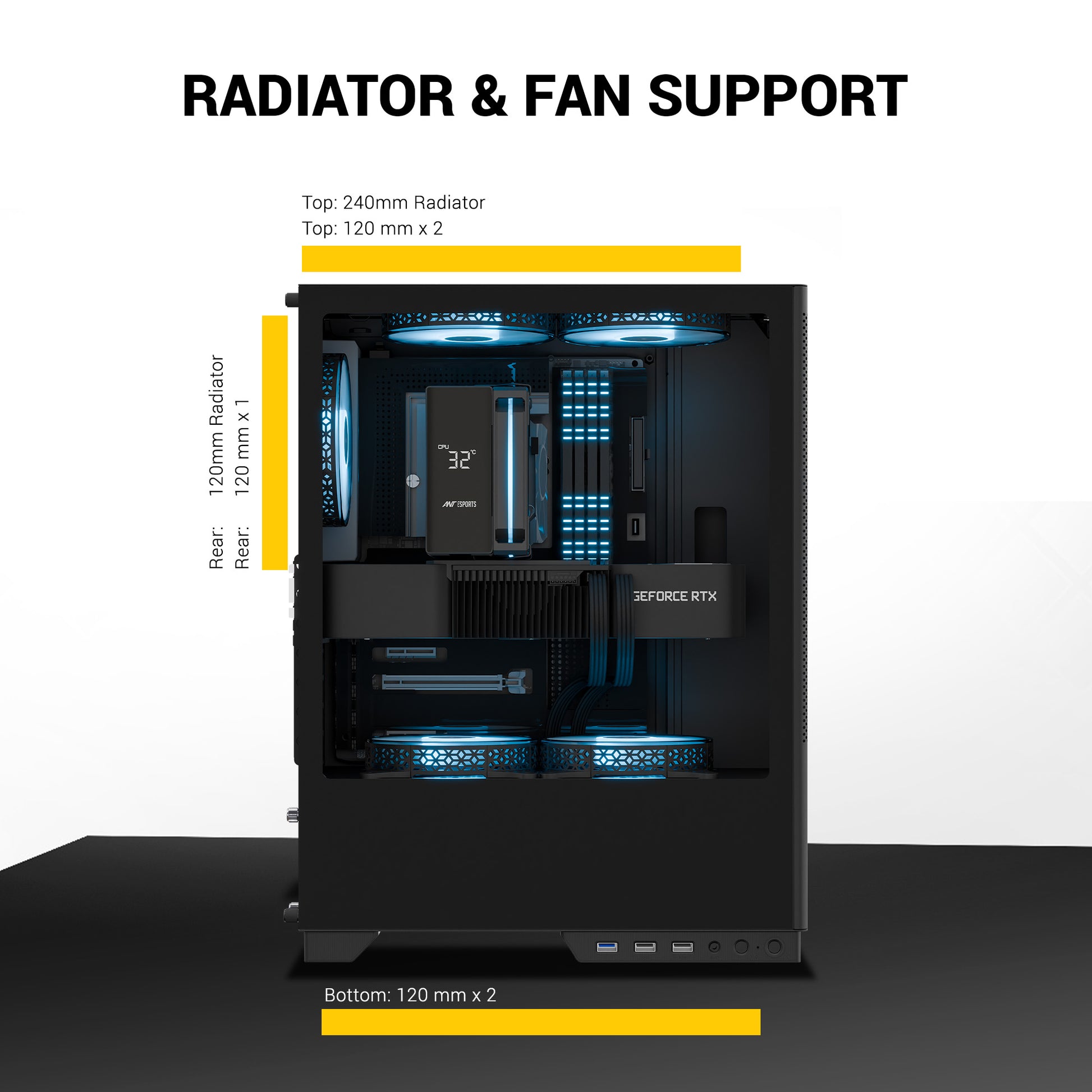 Versatile Cooling Support – Compatible with 240mm top radiators and a 120mm rear radiator for high-performance liquid cooling builds.