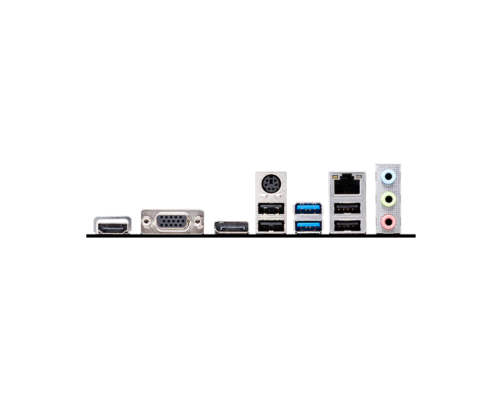 | Back Panel I/O Ports | HDMI VGA DisplayPort Keyboard / Mouse USB 3.2 Gen 1 5Gbps (Type-A) LAN port Audio Connectors USB 2.0 |